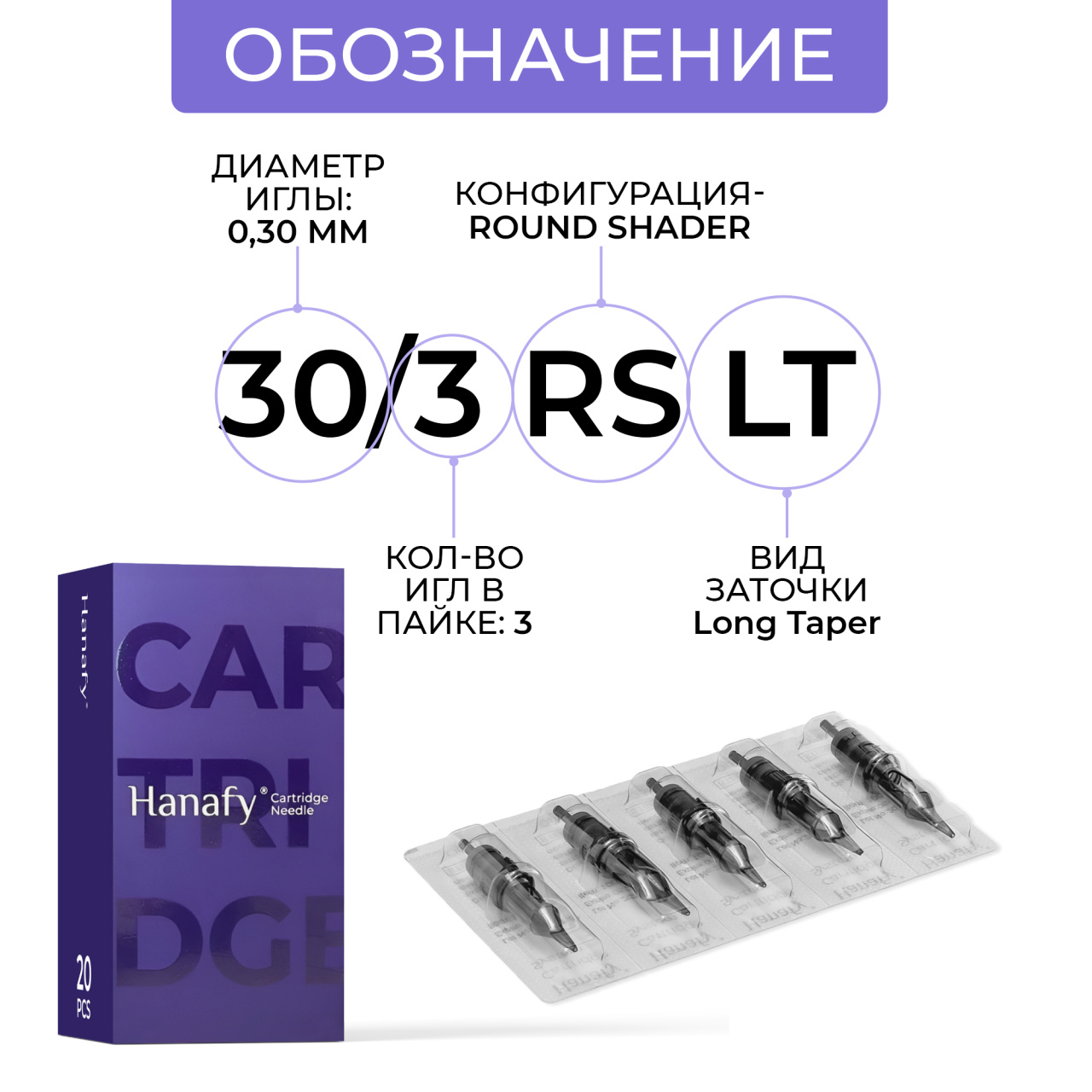 Профессиональные одноразовые картриджи для тату и перманентного макияжа 30/3 RSLT (Round Shader, Long Taper) от Hanafy. 20 штук в индивидуальных стерильных блистерах и фирменной упаковке. В чем их отличие от фиолетовых картриджей Hanafy аналогичной маркировки? Иглы в серых картриджах Hanafy немного мягче, тупее. Хорошо подходят для работы со сложной кожей: жирной, пористой, сосудистой. Работа с серыми картриджами Ханафи также предполагает подгиб иглы.