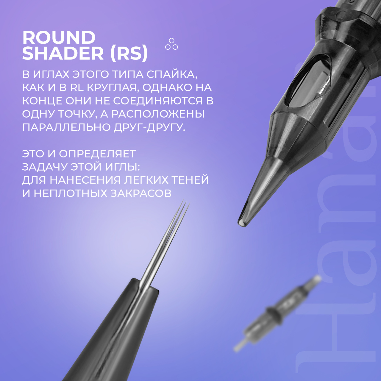 Картридж имеет три спаянных иглы диаметром 0.3 мм, длинной заточки. Спайка круглая, как в картриджах Round Liner, но иглы на конце не соединяются в одну точку. Они распаяны параллельно друг другу. Это определяет основную задачу картриджа Round Shader: нанесение легких теней, градиентов, растушевки и неплотные закрасы.