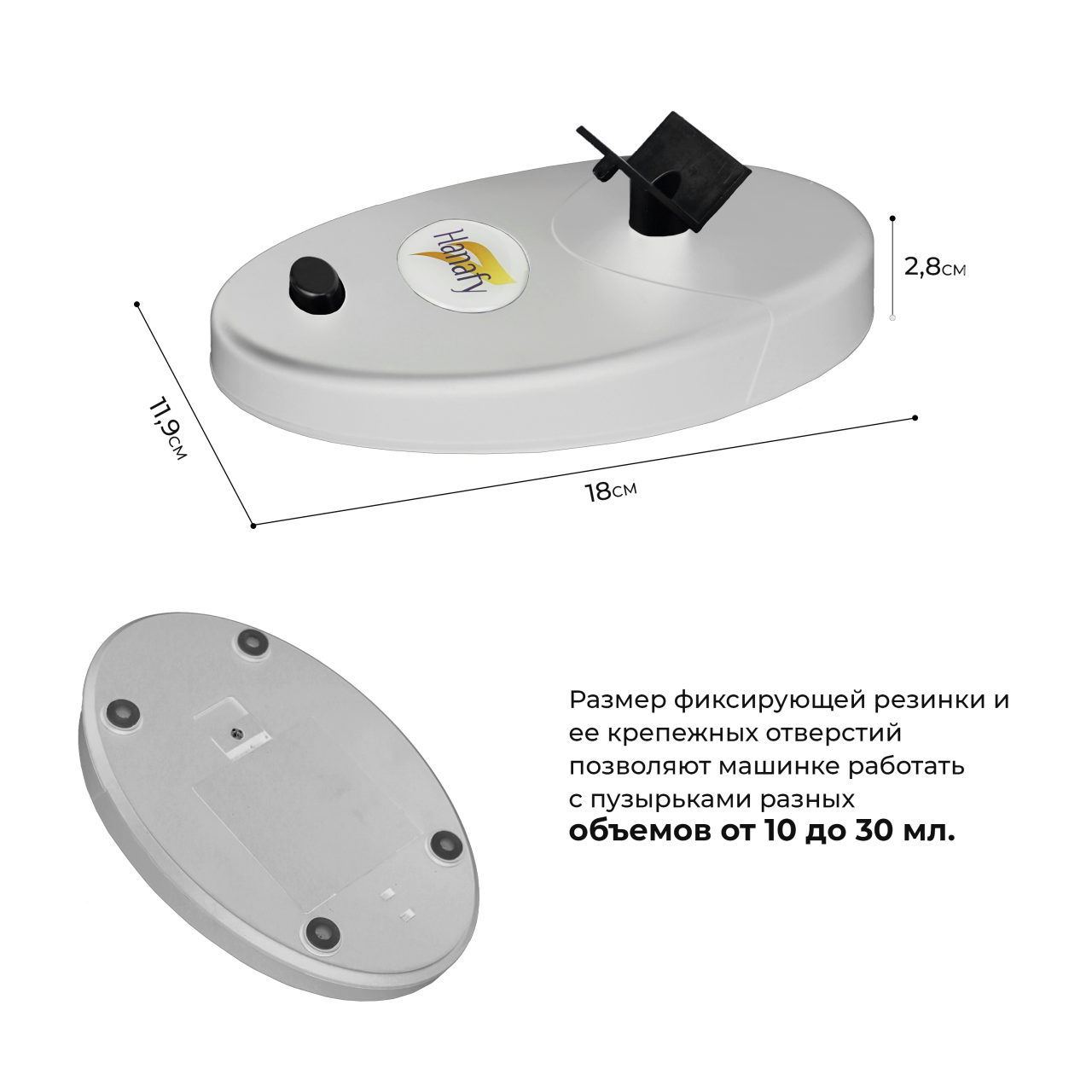 Размер фиксирующей резинки и ее крепежных отверстий позволяют машинке работать с пузырьками разных объемов от 10 до 30 мл. В комплекте есть 2 запасные резинки.
