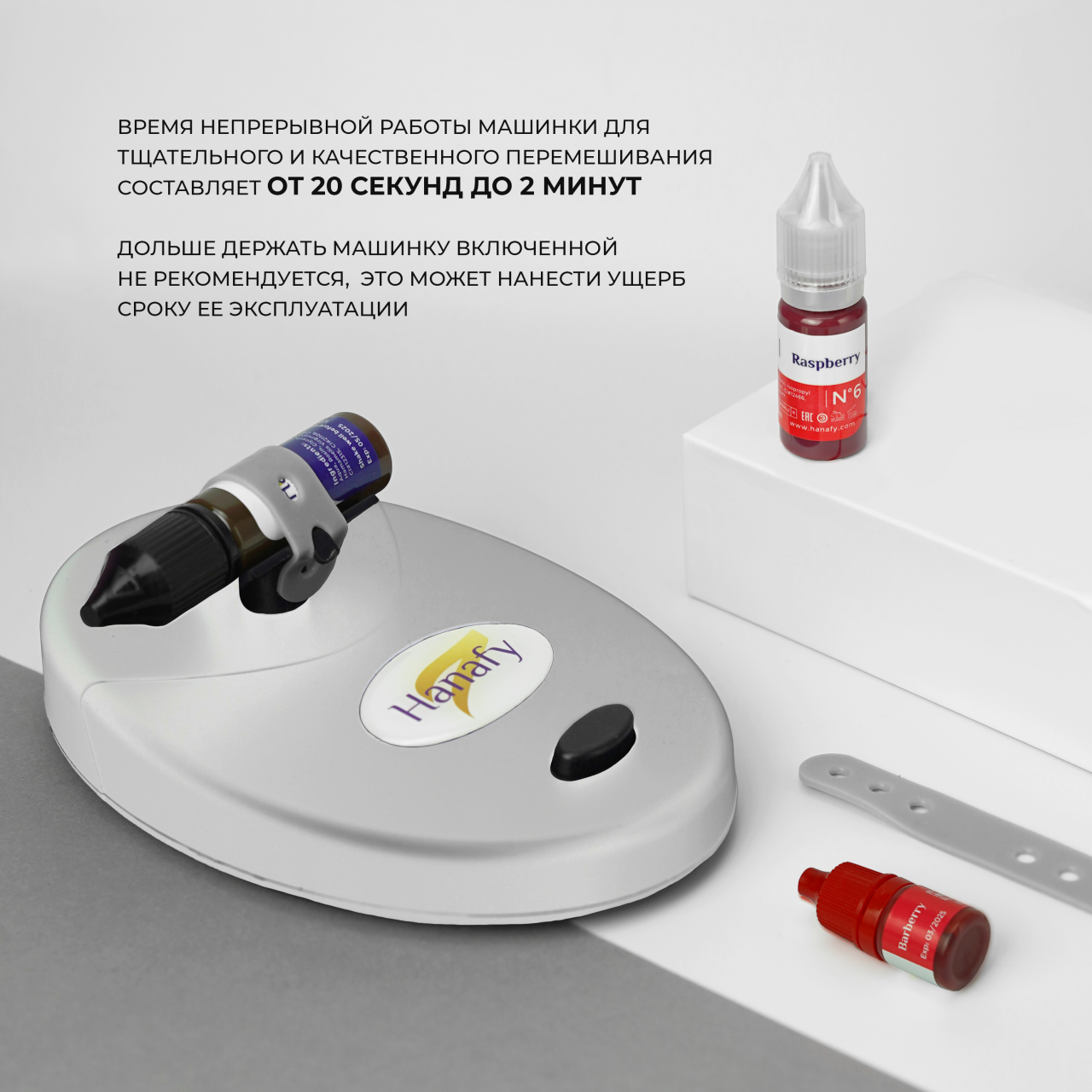 Надежное закрепление пузырька в специальном держателе с помощью плотной резинки с крепежными отверстиями позволяет добиваться быстрого и равномерного перемешивания содержимого бутылочки.