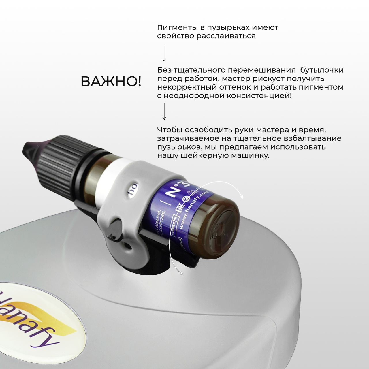 Shaker Machine Hanafy предназначена для быстрого перемешивания пигментов перед работой. Всем известно, что пигменты в пузырьках имеют свойство расслаиваться. Без тщательного перемешивания содержимого бутылочки перед работой мастер рискует получить некорректный оттенок и работать пигментом с неоднородной консистенцией. Чтобы освободить руки мастера и время, затрачиваемое на тщательное взбалтывание пузырьков, мы предлагаем использовать нашу шейкерную машинку.